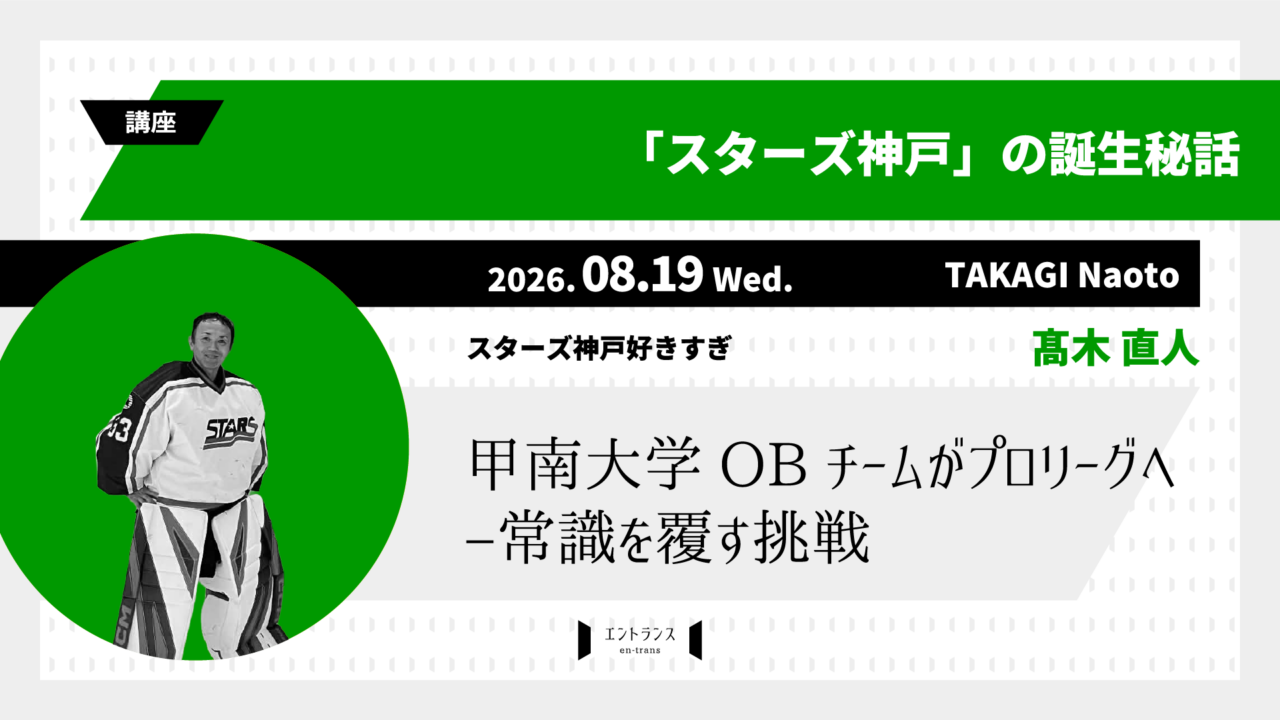 2025年、アイスホッケーのプロリーグ「アジアリーグ」に、西日本初となるチーム「スターズ神戸」が誕生しました。この講座では、そのスターズ神戸の成り立ちや背景、日本のアイスホッケー界の現状、そして地域からプロチームが生まれる意味について掘り下げます。甲南大学アイスホッケー部OBを中心に立ち上がったアマチュアチームが、どのようにしてプロリーグ参入に至ったのか。そのアマチュアチームに18年所属しており、スターズ神戸に人生を救われた私が、現場の視点から日本におけるアイスホッケーのリアルや課題、そして可能性をお話しします。